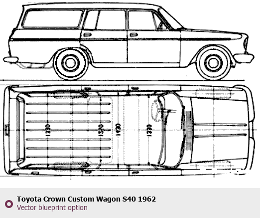 Raster blueprint of the 1962 Toyota Crown Custom Wagon S40 Wagon. This free downloadable image can be used for graphic projects, digital design, and 3D modeling. The file provides accurate exterior proportions of the vehicle. Model year: 1962. Body type: Wagon.