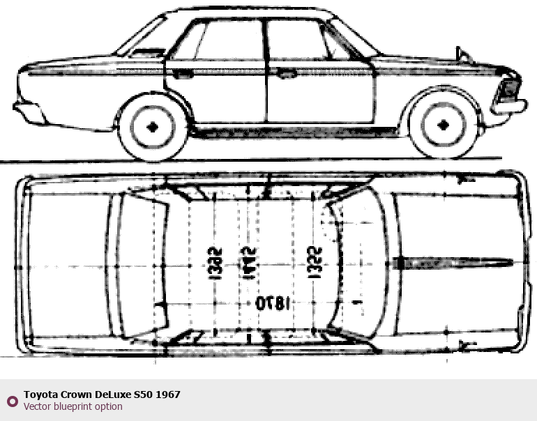 Raster blueprint of the 1967 Toyota Crown DeLuxe S50 Tag. This free downloadable image can be used for graphic projects, digital design, and 3D modeling. The file provides accurate exterior proportions of the vehicle. Model year: 1967. Body type: Tag.
