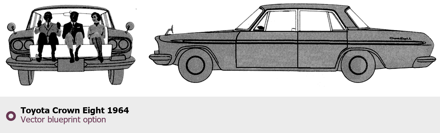 Raster blueprint of the 1964 Toyota Crown Eight Tag. This free downloadable image can be used for graphic projects, digital design, and 3D modeling. The file provides accurate exterior proportions of the vehicle. Model year: 1964. Body type: Tag.