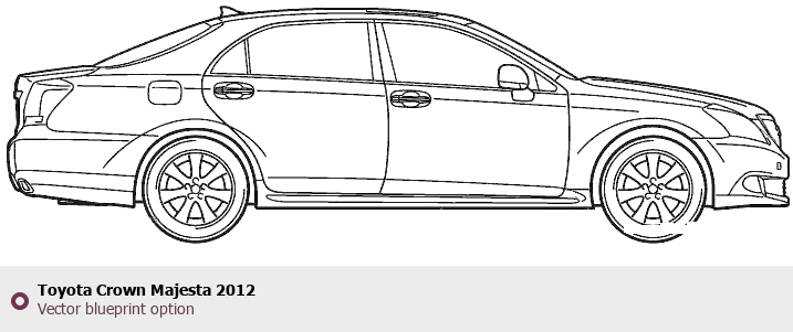 Raster blueprint of the 2012 Toyota Crown Majesta Sedan. This free downloadable image can be used for graphic projects, digital design, and 3D modeling. The file provides accurate exterior proportions of the vehicle. Model year: 2012. Body type: Sedan.