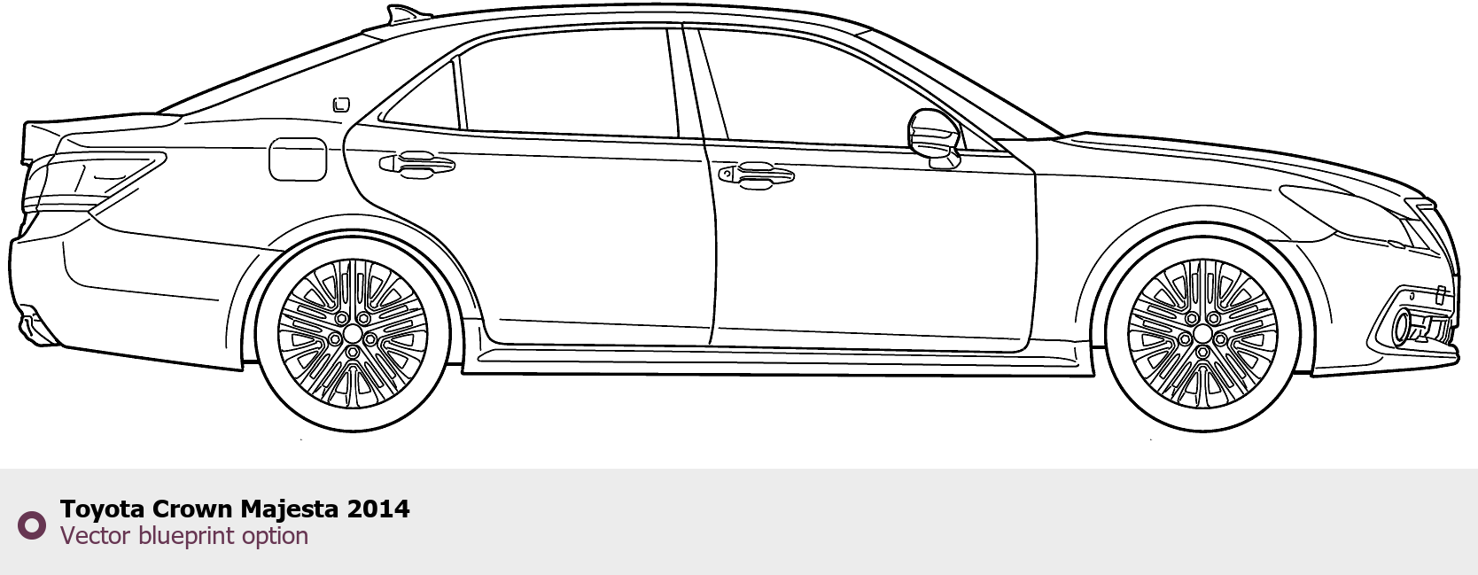 Raster blueprint of the 2014 Toyota Crown Majesta Sedan. This free downloadable image can be used for graphic projects, digital design, and 3D modeling. The file provides accurate exterior proportions of the vehicle. Model year: 2014. Body type: Sedan.