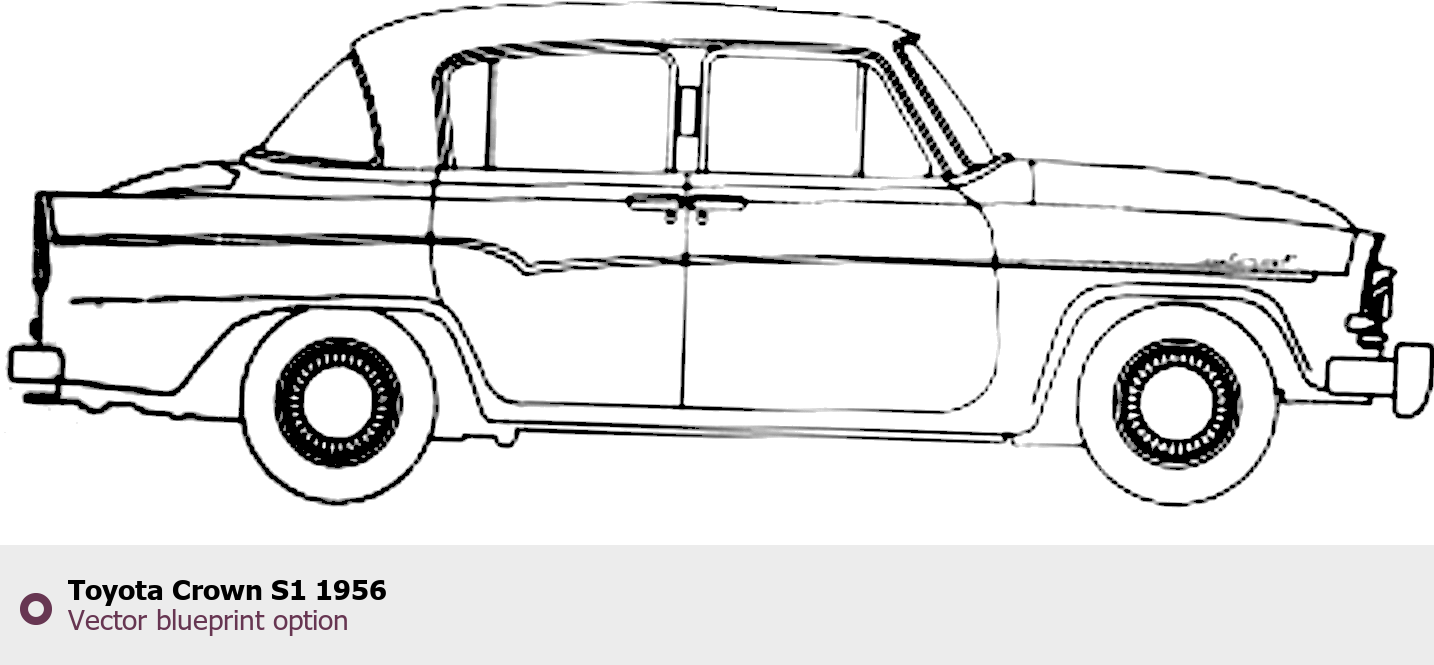 Raster blueprint of the 1956 Toyota Crown S1 Tag. This free downloadable image can be used for graphic projects, digital design, and 3D modeling. The file provides accurate exterior proportions of the vehicle. Model year: 1956. Body type: Tag.
