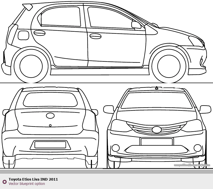 Raster blueprint of the 2011 Toyota Etios Liva IND Tag. This free downloadable image can be used for graphic projects, digital design, and 3D modeling. The file provides accurate exterior proportions of the vehicle. Model year: 2011. Body type: Tag.