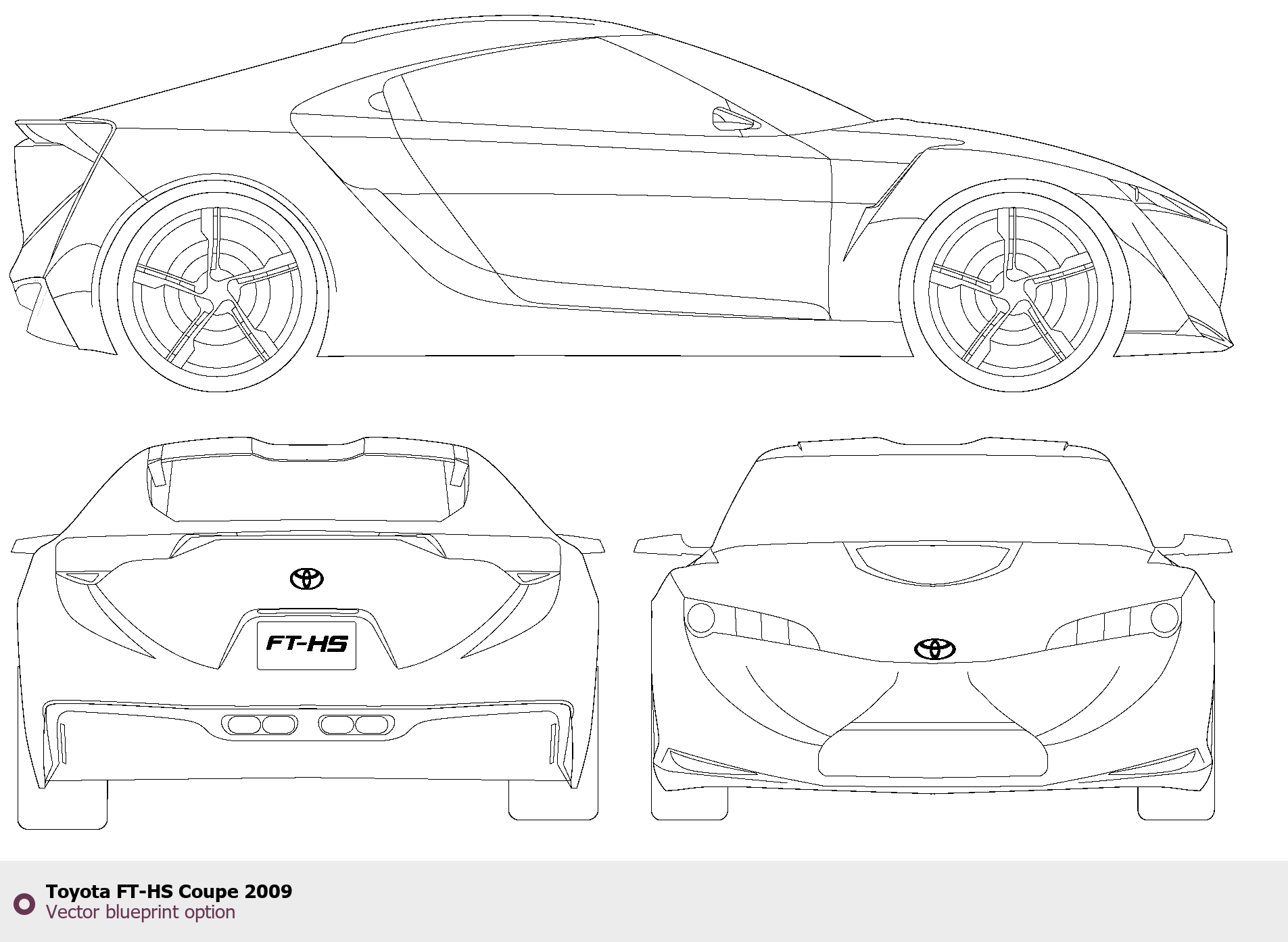 Raster blueprint of the 2009 Toyota FT-HS Coupe Coupe. This free downloadable image can be used for graphic projects, digital design, and 3D modeling. The file provides accurate exterior proportions of the vehicle. Model year: 2009. Body type: Coupe.