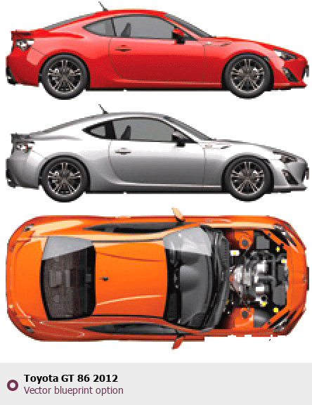 Raster blueprint of the 2012 Toyota GT 86 Coupe. This free downloadable image can be used for graphic projects, digital design, and 3D modeling. The file provides accurate exterior proportions of the vehicle. Model year: 2012. Body type: Coupe.