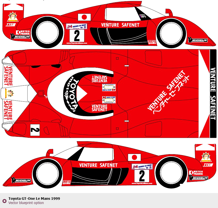 Raster blueprint of the 1999 Toyota GT-One Le Mans Tag. This free downloadable image can be used for graphic projects, digital design, and 3D modeling. The file provides accurate exterior proportions of the vehicle. Model year: 1999. Body type: Tag.