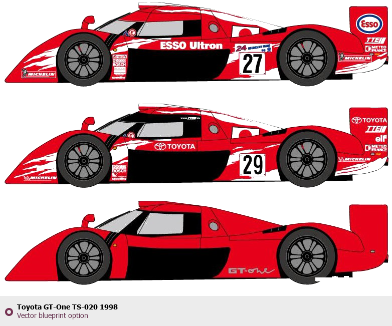 Raster blueprint of the 1998 Toyota GT-One TS-020 Tag. This free downloadable image can be used for graphic projects, digital design, and 3D modeling. The file provides accurate exterior proportions of the vehicle. Model year: 1998. Body type: Tag.