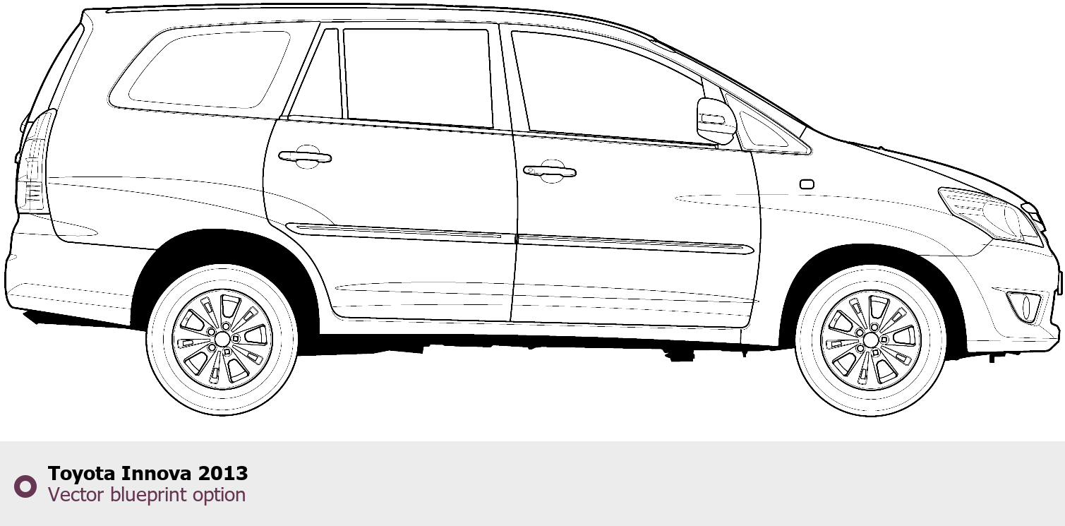Raster blueprint of the 2013 Toyota Innova Minivan. This free downloadable image can be used for graphic projects, digital design, and 3D modeling. The file provides accurate exterior proportions of the vehicle. Model year: 2013. Body type: Minivan.