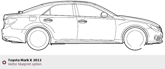 Raster blueprint of the 2012 Toyota Mark X Sedan. This free downloadable image can be used for graphic projects, digital design, and 3D modeling. The file provides accurate exterior proportions of the vehicle. Model year: 2012. Body type: Sedan.