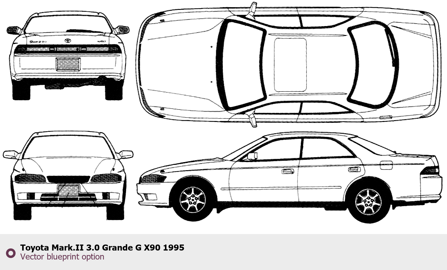 Raster blueprint of the 1995 Toyota Mark.II 3.0 Grande G X90 Tag. This free downloadable image can be used for graphic projects, digital design, and 3D modeling. The file provides accurate exterior proportions of the vehicle. Model year: 1995. Body type: Tag.