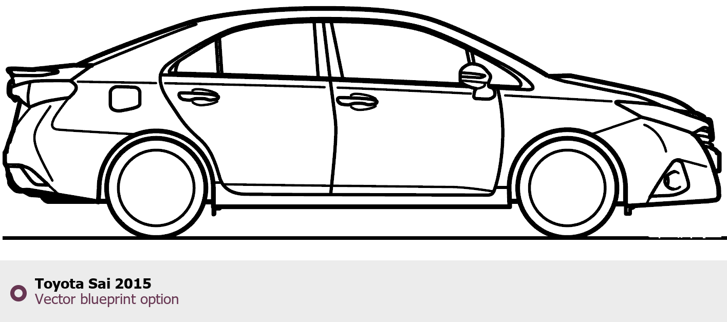 Raster blueprint of the 2015 Toyota Sai Sedan. This free downloadable image can be used for graphic projects, digital design, and 3D modeling. The file provides accurate exterior proportions of the vehicle. Model year: 2015. Body type: Sedan.