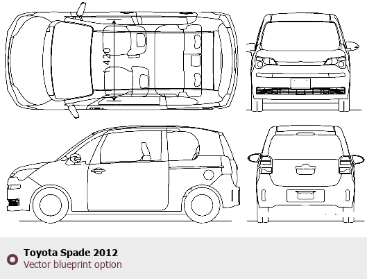 Raster blueprint of the 2012 Toyota Spade Minivan. This free downloadable image can be used for graphic projects, digital design, and 3D modeling. The file provides accurate exterior proportions of the vehicle. Model year: 2012. Body type: Minivan.