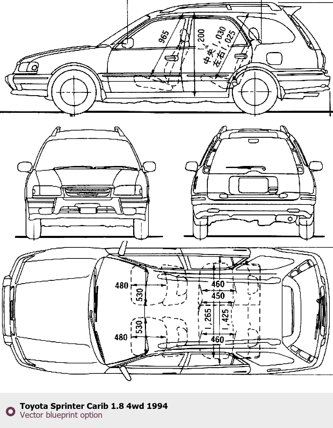 Raster blueprint of the 1994 Toyota Sprinter Carib 1.8 4wd Tag. This free downloadable image can be used for graphic projects, digital design, and 3D modeling. The file provides accurate exterior proportions of the vehicle. Model year: 1994. Body type: Tag.