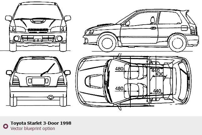Raster blueprint of the 1998 Toyota Starlet 3-Door Tag. This free downloadable image can be used for graphic projects, digital design, and 3D modeling. The file provides accurate exterior proportions of the vehicle. Model year: 1998. Body type: Tag.