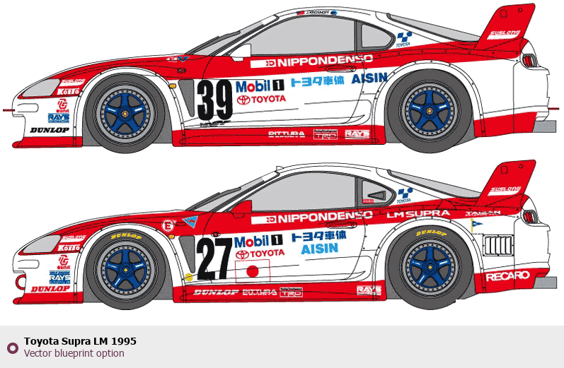 Raster blueprint of the 1995 Toyota Supra LM Coupe. This free downloadable image can be used for graphic projects, digital design, and 3D modeling. The file provides accurate exterior proportions of the vehicle. Model year: 1995. Body type: Coupe.