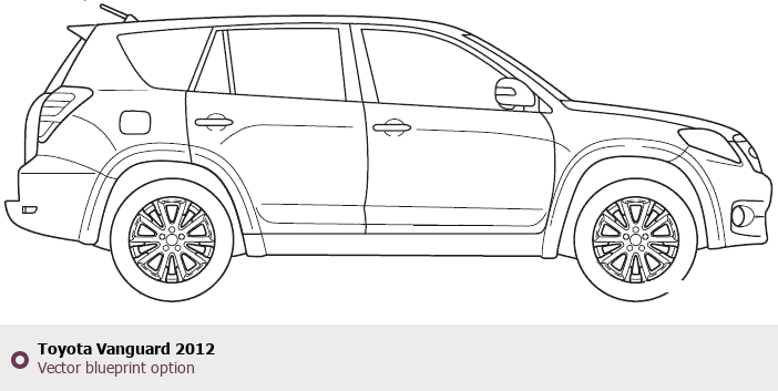 Raster blueprint of the 2012 Toyota Vanguard SUV. This free downloadable image can be used for graphic projects, digital design, and 3D modeling. The file provides accurate exterior proportions of the vehicle. Model year: 2012. Body type: SUV.