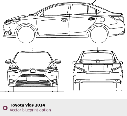 Raster blueprint of the 2014 Toyota Vios Sedan. This free downloadable image can be used for graphic projects, digital design, and 3D modeling. The file provides accurate exterior proportions of the vehicle. Model year: 2014. Body type: Sedan.