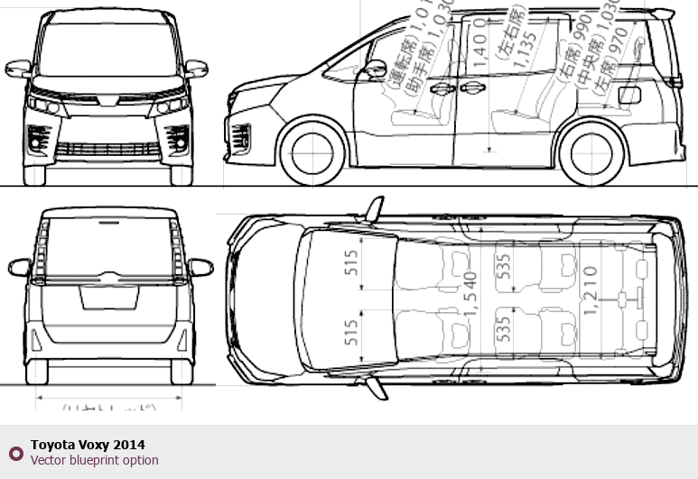 Raster blueprint of the 2014 Toyota Voxy Minivan. This free downloadable image can be used for graphic projects, digital design, and 3D modeling. The file provides accurate exterior proportions of the vehicle. Model year: 2014. Body type: Minivan.