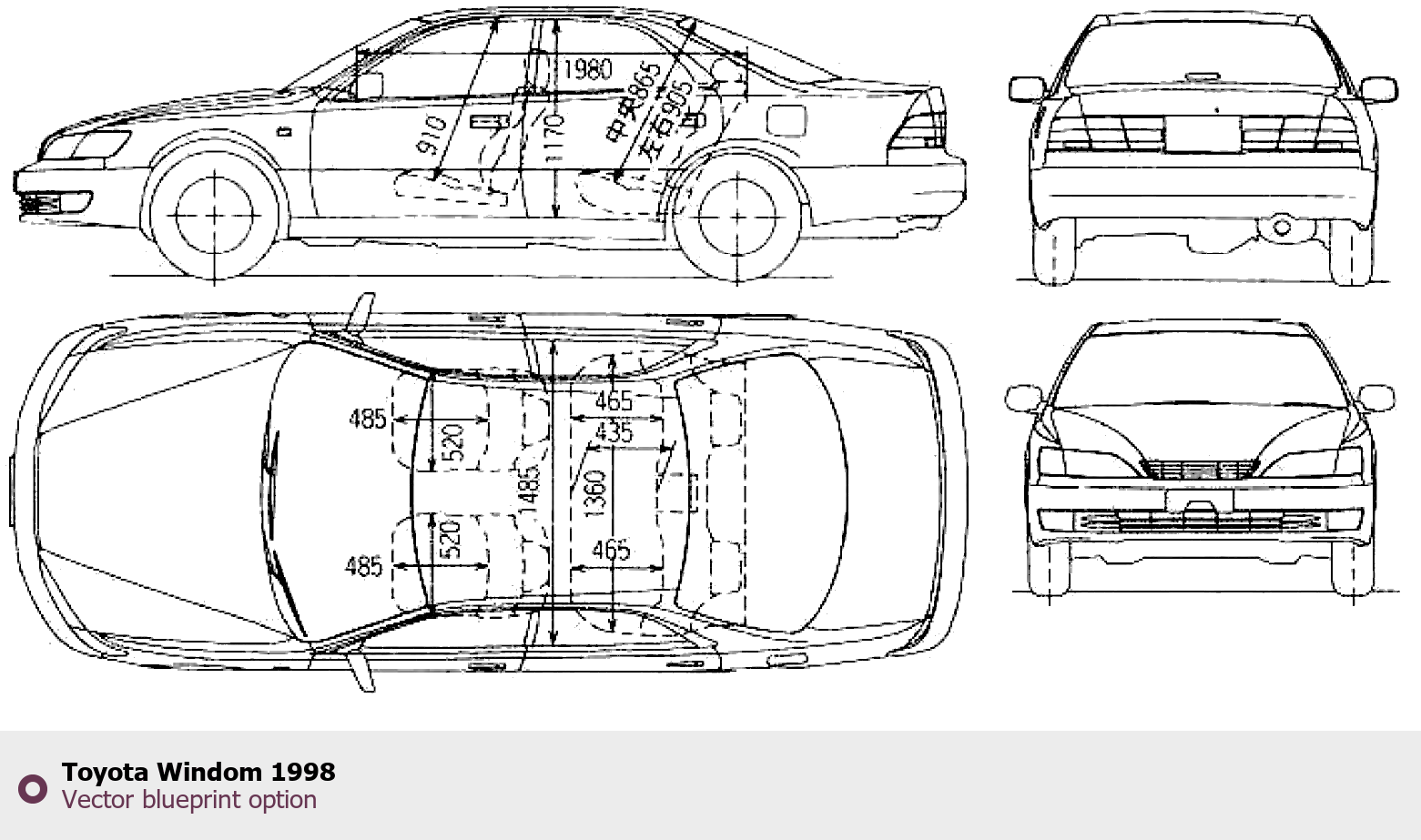 Raster blueprint of the 1998 Toyota Windom Sedan. This free downloadable image can be used for graphic projects, digital design, and 3D modeling. The file provides accurate exterior proportions of the vehicle. Model year: 1998. Body type: Sedan.