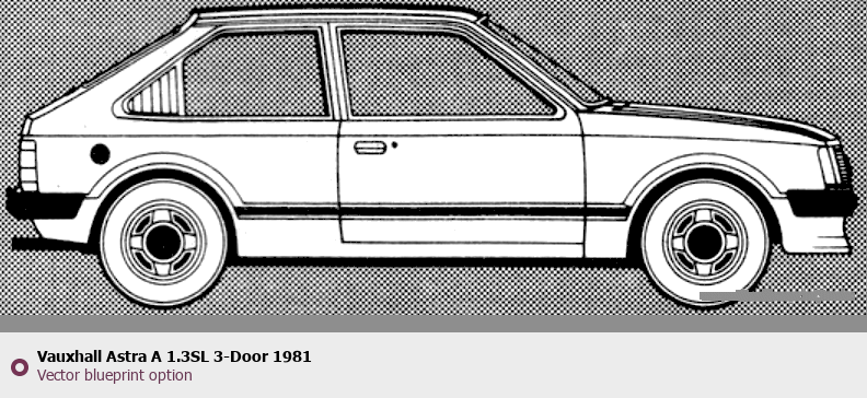 Raster blueprint of the 1981 Vauxhall Astra A 1.3SL 3-Door Tag. This free downloadable image can be used for graphic projects, digital design, and 3D modeling. The file provides accurate exterior proportions of the vehicle. Model year: 1981. Body type: Tag.