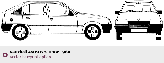 Raster blueprint of the 1984 Vauxhall Astra B 5-Door Tag. This free downloadable image can be used for graphic projects, digital design, and 3D modeling. The file provides accurate exterior proportions of the vehicle. Model year: 1984. Body type: Tag.
