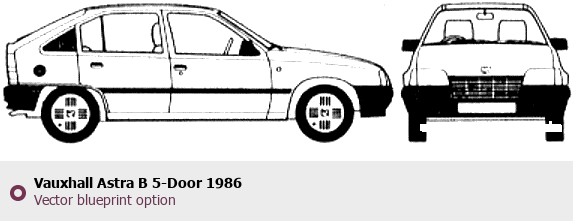 Raster blueprint of the 1986 Vauxhall Astra B 5-Door Tag. This free downloadable image can be used for graphic projects, digital design, and 3D modeling. The file provides accurate exterior proportions of the vehicle. Model year: 1986. Body type: Tag.