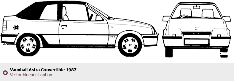 Raster blueprint of the 1987 Vauxhall Astra Convertible Cabriolet. This free downloadable image can be used for graphic projects, digital design, and 3D modeling. The file provides accurate exterior proportions of the vehicle. Model year: 1987. Body type: Cabriolet.