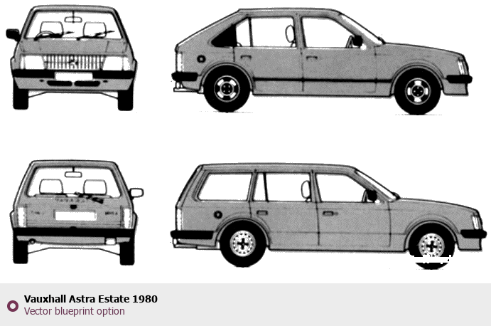 Raster blueprint of the 1980 Vauxhall Astra Estate Wagon. This free downloadable image can be used for graphic projects, digital design, and 3D modeling. The file provides accurate exterior proportions of the vehicle. Model year: 1980. Body type: Wagon.