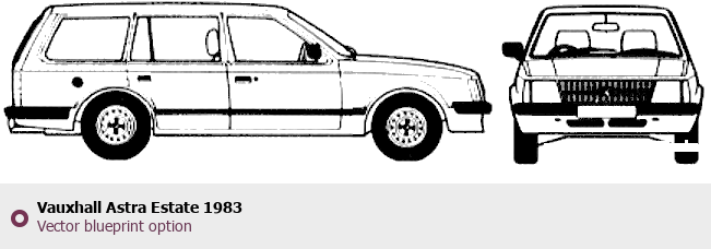 Raster blueprint of the 1983 Vauxhall Astra Estate Wagon. This free downloadable image can be used for graphic projects, digital design, and 3D modeling. The file provides accurate exterior proportions of the vehicle. Model year: 1983. Body type: Wagon.