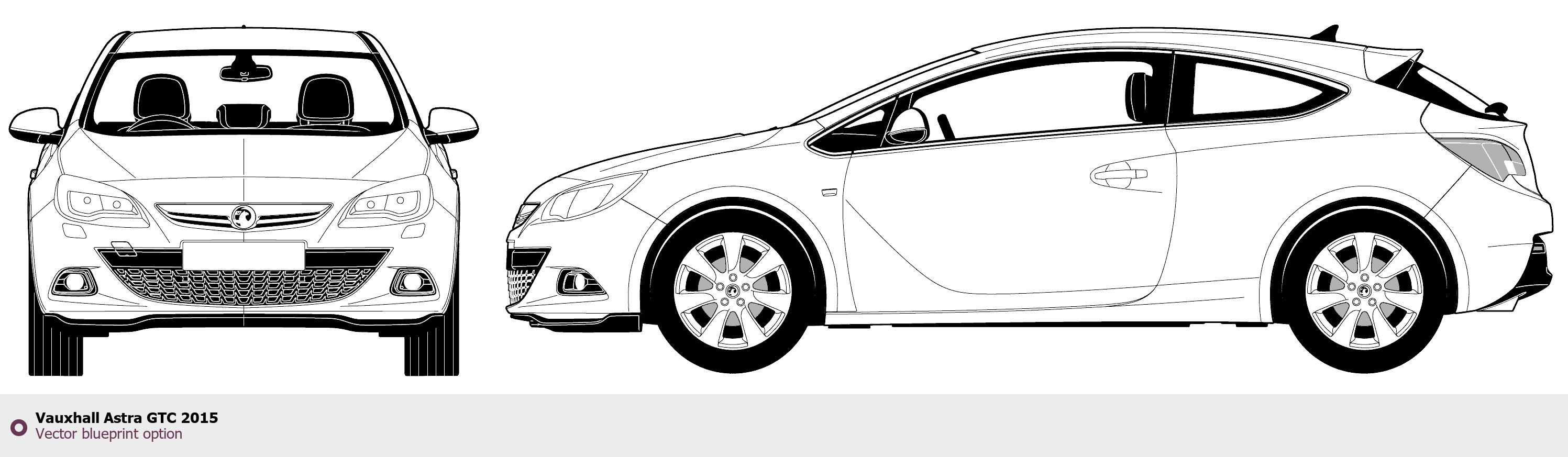 Raster blueprint of the 2015 Vauxhall Astra GTC Tag. This free downloadable image can be used for graphic projects, digital design, and 3D modeling. The file provides accurate exterior proportions of the vehicle. Model year: 2015. Body type: Tag.