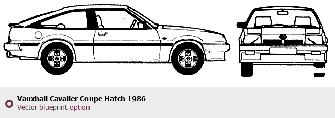 Raster blueprint of the 1986 Vauxhall Cavalier Coupe Hatch Coupe. This free downloadable image can be used for graphic projects, digital design, and 3D modeling. The file provides accurate exterior proportions of the vehicle. Model year: 1986. Body type: Coupe.