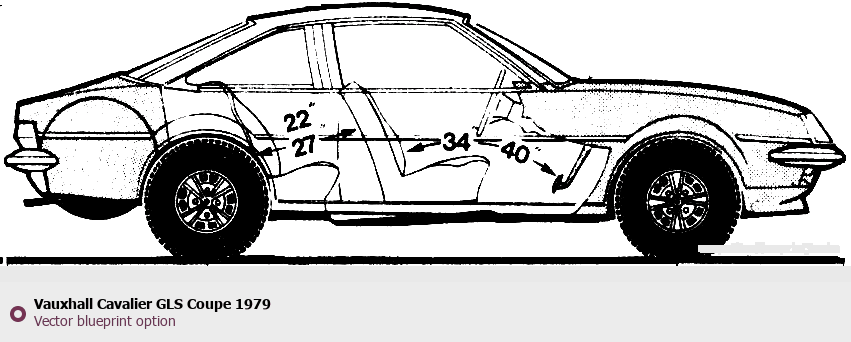 Raster blueprint of the 1979 Vauxhall Cavalier GLS Coupe Coupe. This free downloadable image can be used for graphic projects, digital design, and 3D modeling. The file provides accurate exterior proportions of the vehicle. Model year: 1979. Body type: Coupe.