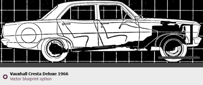 Raster blueprint of the 1966 Vauxhall Cresta Deluxe Tag. This free downloadable image can be used for graphic projects, digital design, and 3D modeling. The file provides accurate exterior proportions of the vehicle. Model year: 1966. Body type: Tag.