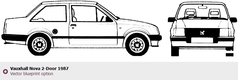 Raster blueprint of the 1987 Vauxhall Nova 2-Door Hatchback. This free downloadable image can be used for graphic projects, digital design, and 3D modeling. The file provides accurate exterior proportions of the vehicle. Model year: 1987. Body type: Hatchback.