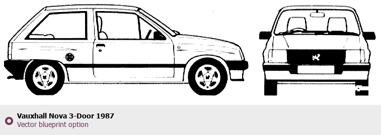 Raster blueprint of the 1987 Vauxhall Nova 3-Door Hatchback. This free downloadable image can be used for graphic projects, digital design, and 3D modeling. The file provides accurate exterior proportions of the vehicle. Model year: 1987. Body type: Hatchback.