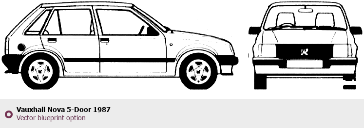 Raster blueprint of the 1987 Vauxhall Nova 5-Door Hatchback. This free downloadable image can be used for graphic projects, digital design, and 3D modeling. The file provides accurate exterior proportions of the vehicle. Model year: 1987. Body type: Hatchback.