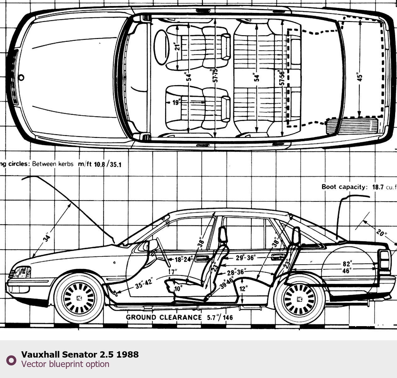 Raster blueprint of the 1988 Vauxhall Senator 2.5 Tag. This free downloadable image can be used for graphic projects, digital design, and 3D modeling. The file provides accurate exterior proportions of the vehicle. Model year: 1988. Body type: Tag.