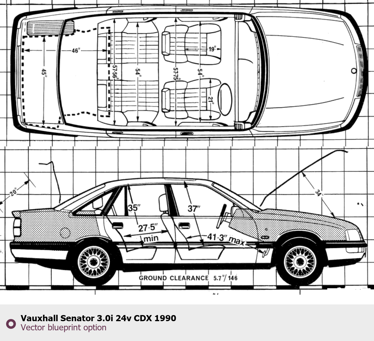 Raster blueprint of the 1990 Vauxhall Senator 3.0i 24v CDX Tag. This free downloadable image can be used for graphic projects, digital design, and 3D modeling. The file provides accurate exterior proportions of the vehicle. Model year: 1990. Body type: Tag.