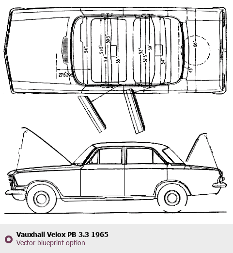 Raster blueprint of the 1965 Vauxhall Velox PB 3.3 Tag. This free downloadable image can be used for graphic projects, digital design, and 3D modeling. The file provides accurate exterior proportions of the vehicle. Model year: 1965. Body type: Tag.
