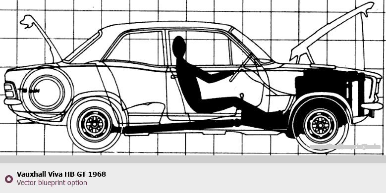 Raster blueprint of the 1968 Vauxhall Viva HB GT Hatchback. This free downloadable image can be used for graphic projects, digital design, and 3D modeling. The file provides accurate exterior proportions of the vehicle. Model year: 1968. Body type: Hatchback.
