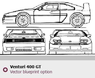 Raster blueprint of the Venturi 400 GT Coupe. This free downloadable image can be used for graphic projects, digital design, and 3D modeling. The file provides accurate exterior proportions of the vehicle. Body type: Coupe.