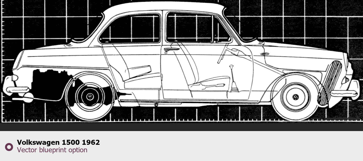 Raster blueprint of the 1962 Volkswagen 1500 Tag. This free downloadable image can be used for graphic projects, digital design, and 3D modeling. The file provides accurate exterior proportions of the vehicle. Model year: 1962. Body type: Tag.
