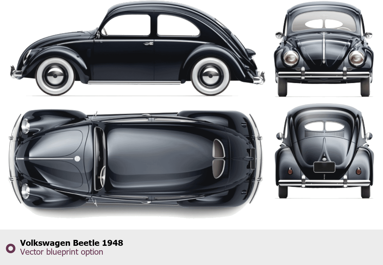 Raster blueprint of the 1948 Volkswagen Beetle Tag. This free downloadable image can be used for graphic projects, digital design, and 3D modeling. The file provides accurate exterior proportions of the vehicle. Model year: 1948. Body type: Tag.