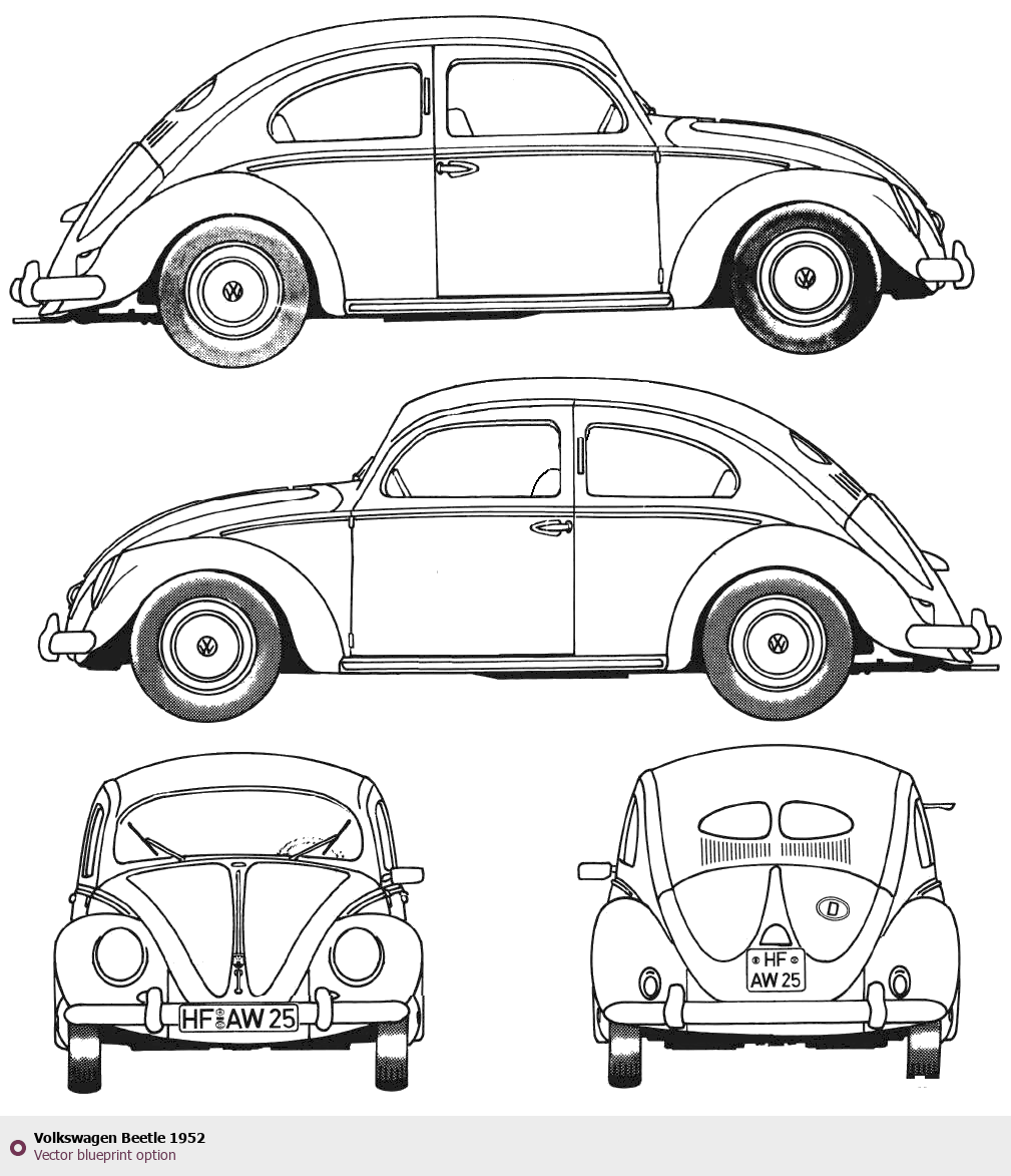 Raster blueprint of the 1952 Volkswagen Beetle Tag. This free downloadable image can be used for graphic projects, digital design, and 3D modeling. The file provides accurate exterior proportions of the vehicle. Model year: 1952. Body type: Tag.