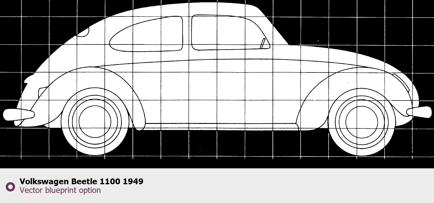 Raster blueprint of the 1949 Volkswagen Beetle 1100 Tag. This free downloadable image can be used for graphic projects, digital design, and 3D modeling. The file provides accurate exterior proportions of the vehicle. Model year: 1949. Body type: Tag.