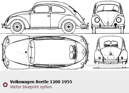 Raster blueprint of the 1955 Volkswagen Beetle 1200 Tag. This free downloadable image can be used for graphic projects, digital design, and 3D modeling. The file provides accurate exterior proportions of the vehicle. Model year: 1955. Body type: Tag.