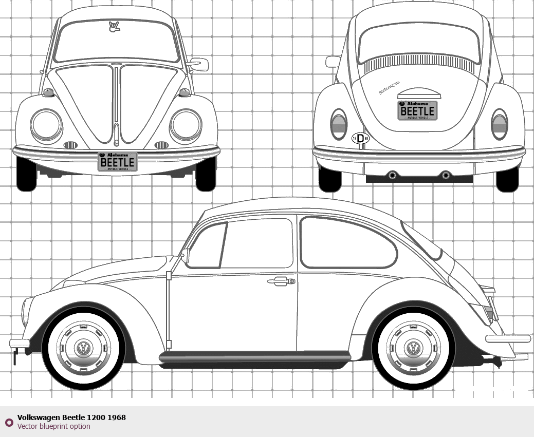 Raster blueprint of the 1968 Volkswagen Beetle 1200 Tag. This free downloadable image can be used for graphic projects, digital design, and 3D modeling. The file provides accurate exterior proportions of the vehicle. Model year: 1968. Body type: Tag.