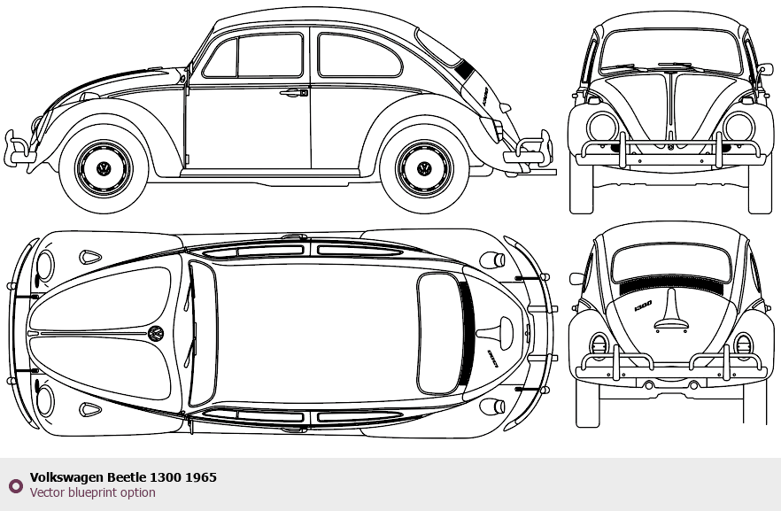 Raster blueprint of the 1965 Volkswagen Beetle 1300 Tag. This free downloadable image can be used for graphic projects, digital design, and 3D modeling. The file provides accurate exterior proportions of the vehicle. Model year: 1965. Body type: Tag.