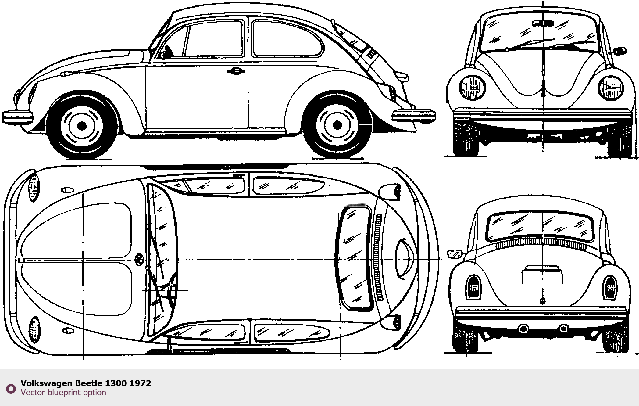 Raster blueprint of the 1972 Volkswagen Beetle 1300 Tag. This free downloadable image can be used for graphic projects, digital design, and 3D modeling. The file provides accurate exterior proportions of the vehicle. Model year: 1972. Body type: Tag.