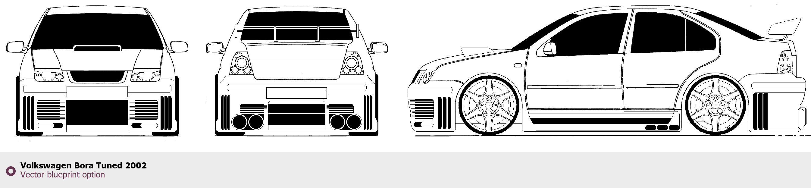 Raster blueprint of the 2002 Volkswagen Bora Tuned Tag. This free downloadable image can be used for graphic projects, digital design, and 3D modeling. The file provides accurate exterior proportions of the vehicle. Model year: 2002. Body type: Tag.